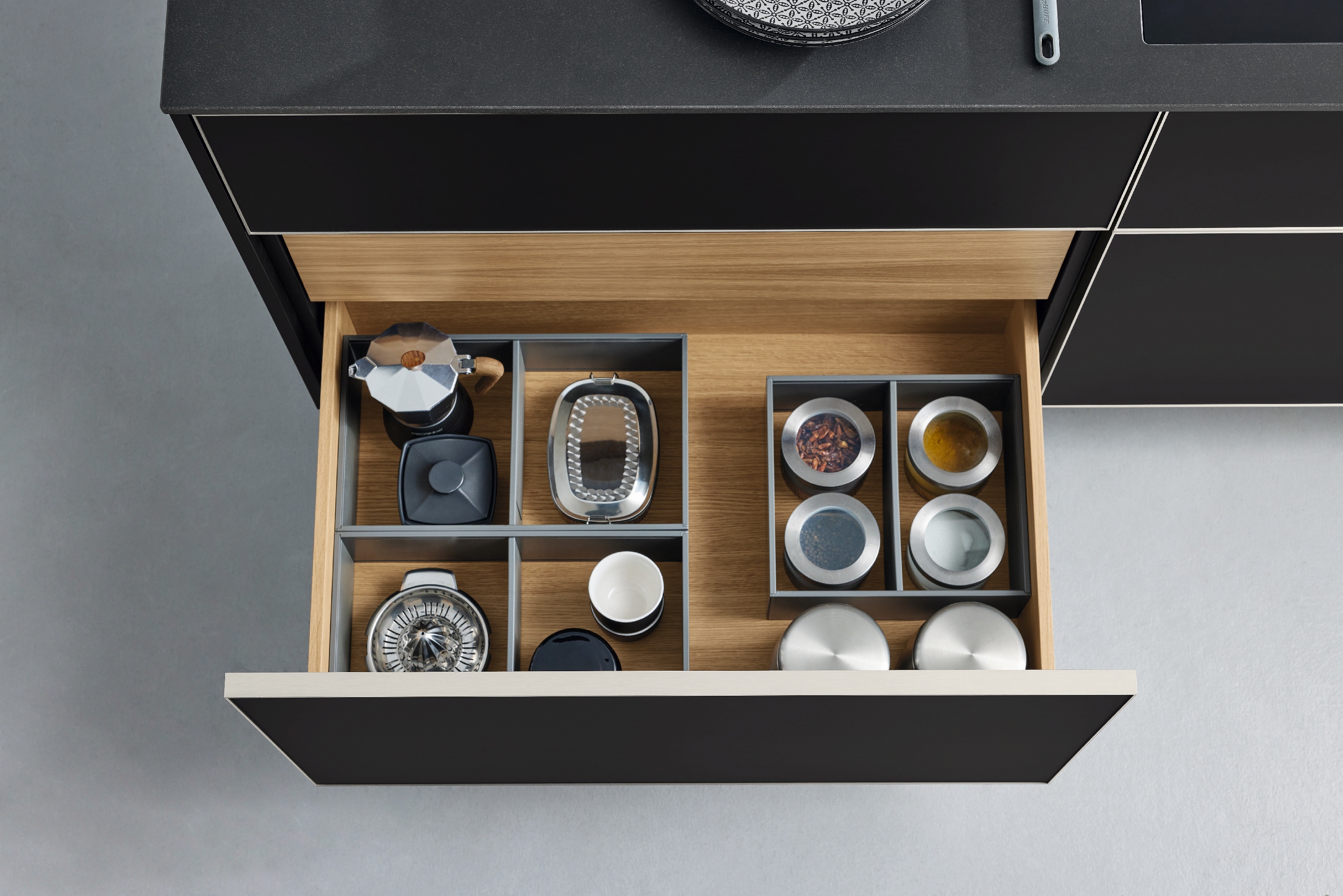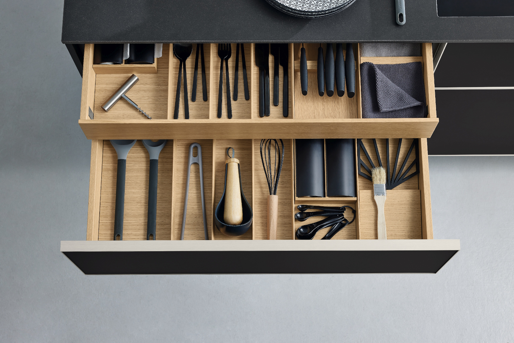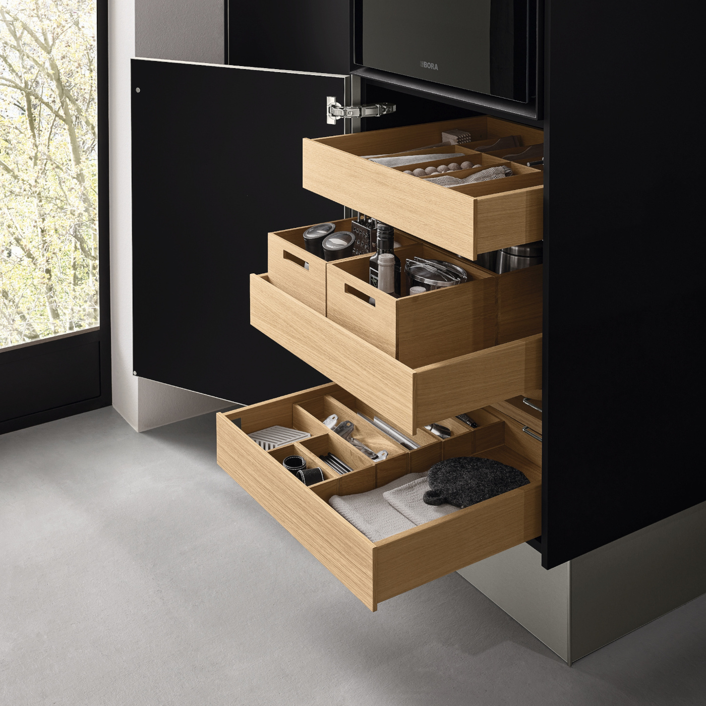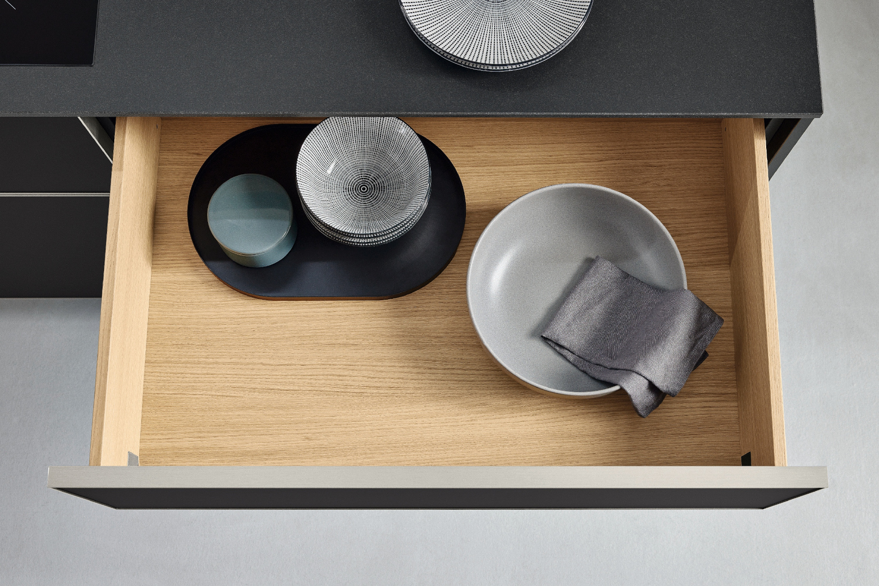 Die LEGRABOX-Metallzarge wird in einem aufwendigen Verfahren von der Firma Häfele mit einer hochwertigen echten Eiche furniert. Die Rückwand und der Boden sind ebenfalls furniert. Damit bleiben die positiven Eigenschaften der Metallzarge erhalten und die Schubkästen und Auszüge erhalten durch das hochwertige Furnier die Wertigkeit eines Holzschubkastens.
