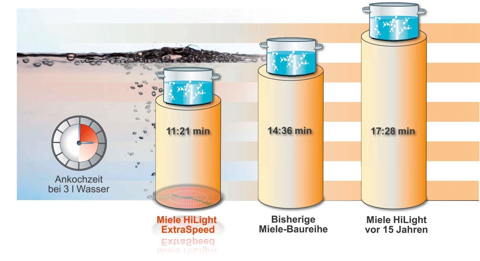 Für das Ankochen von drei Liter Wasser benötigen die neuen ExtraSpeed-Kochfelder gut ein Drittel weniger Zeit als ein 15 Jahre altes HiLight-Kochfeld von Miele. Das ist umso erstaunlicher, weil die rot glühenden Heizkörper unter Glaskeramik zwar eine bewährte Technologie sind, deren Potenzial jedoch ausgereizt schien.
